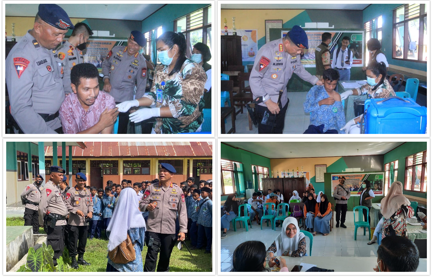 Halut, Galela. TM – Dansat Brimob Polda Maluku Utara Kombes Pol Muhamad Erwin, SH, mengunjungi lokasi akselerasi vaksinasi kalangan pelajar di MTs dan SMK Merah Putih di Kecamatan Galela Barat, Halmahera Utara pada Kamis (31/03/2022).