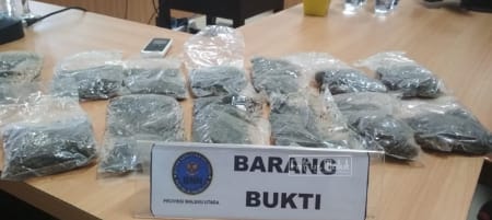 Selain barang bukti sejumlah 13 bungkus plastik berisikan daun kering yang diduga jenis ganja itu dengan berat kurang lebih 5.879,15 gram petugas BNN Provinsi Malut juga mengamankan 1 buah telpon seluler merek Nokia berwarna putih.