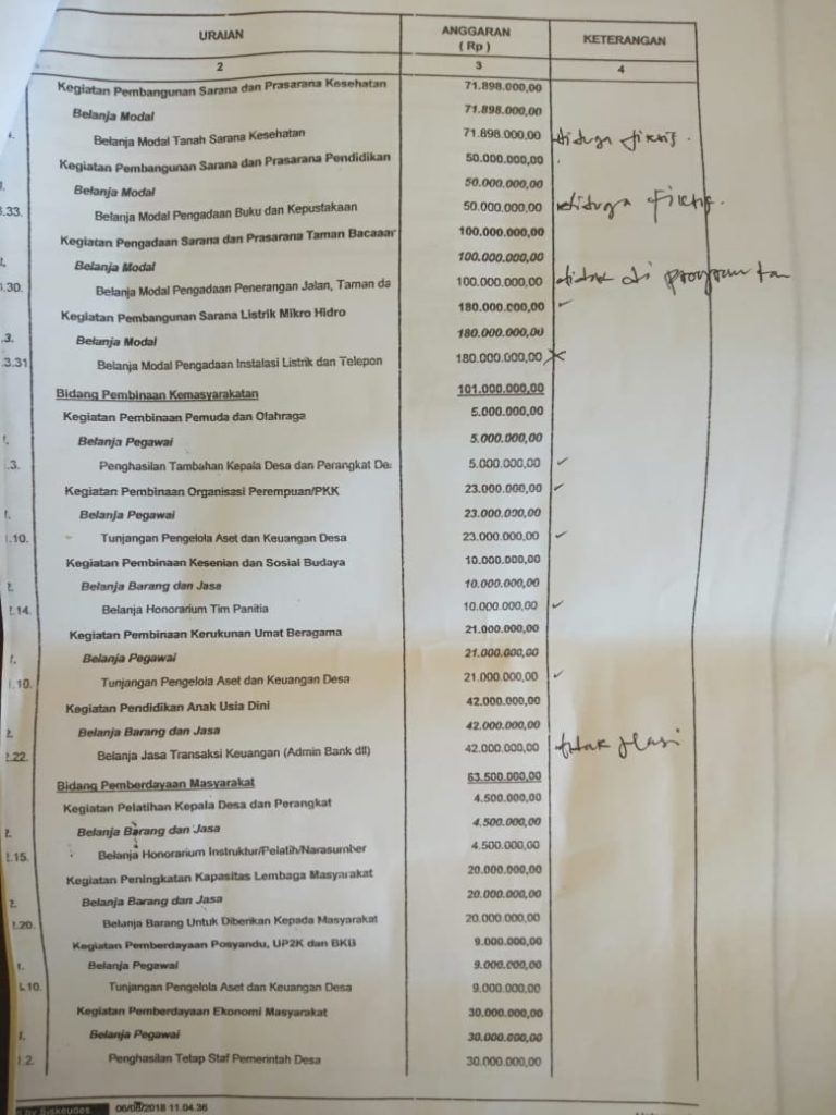 Mereka juga diduga telah membuat program yang tidak masuk dalam pembahasan desa yakni, Jembatan layang batu dua dengan anggaran sebesar 50 juta rupiah, Rumah baca, 50 juta rupiah, Pembuatan taman baca/wisata dan Belanja modal penerangan jalan, 100 juta rupiah,” ungkap sumber.