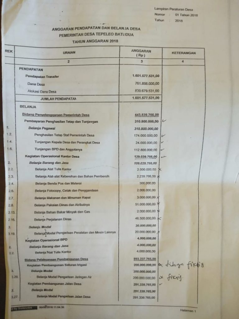“Hampir semua yang tercantum didalam APBDes Tepeleo Batu Dua itu tidak benar (Fiktif). Itu baru 2018, belum lagi tahun 2017 dan 2016 punya. Beberapa program di Tepeleo Batu Dua itu tidak benar, di lapangan tidak ada dan anggarannya tidak sesuai dengan apa yang mereka tulis,” ungkap sumber terpercaya media ini, Senin (4/2/2019).
