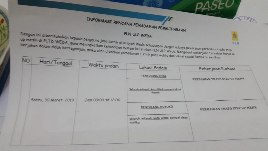 Halteng TM.com – Kepala PLN Weda Ahmad Fikar kepada wartawan di ruang kerjanya menyampaikan bahwa Sabtu, (30/03/2019) besok pukul 09.00 – 12.00 Wit pihaknya berencana melakukan pemadaman Listrik secara keseluruhan sehingga pihaknya melayangkan surat pemberitahuan terlebih dulu kepada pelanggan.