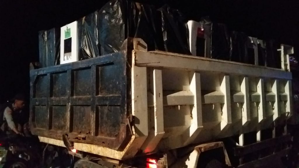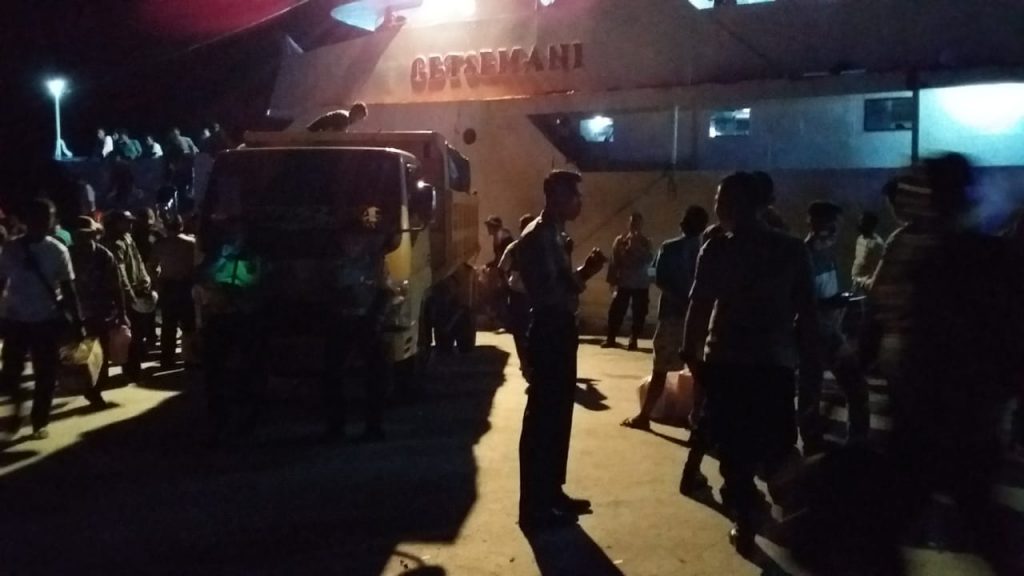 Halteng TM.com – Kapolres Halteng AKBP Andri Hariyanto SIK didampingi Waka Polres Halteng Kompol Jasim Hoda SH, dan sejumlah Perwira Polres Halteng sekaligis puluhan personil yang mengawal ketat pergeseran 83 kotak suara dari wilayah Daerah Pemilihan (Dapil) II (dua) Patani ke KPU Halteng menggunakan kapal KM Getsemani Senin, (29/04/2019) pukul 19.10 Wit bertempat di Pelabuhan Laut Weda jalan Ahmad Baswan Desa Fidi Jaya Kecamatan Weda Kabupaten Halmahera Tengah.