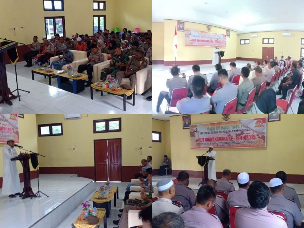 Kapolres Halteng dalam sambutan yang intinya bahwa halal bi halal ini dilaksanakan untuk mempererat tali silaturahmi antar polisi dan masyarakat, sekaligus menyambut HUT Bhayangkara ke-73. Sehingga berharap, HUT Bhayangkara ke-73 para personel Polri lebih profesional dalam melaksanakan tugas dan kewajibannya,” ujarnya.