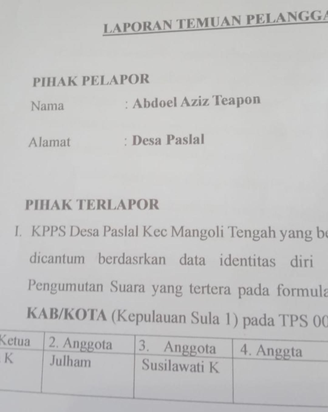 Jainudin yang juga Caleg DPRD Provinsi Maluku Utara Dapil 5 Sula-Taliabu itu menjelaskan Berdasarkan uraian Peristiwa sebagiaman di jelaskan di atas maka dapat diduga Petugas KPPS dalam menjalankan tugas melakukan perbuatan melawan hukum, yang bertentangan Undang-Undang Republik Indonesia Nomor 7 tahun 2017 Tentang Pemilihan Umum Dengan demikian diharpakan kepada BAWASLU Kabupaten Kepulauan Sula, dapat mengeluarkan rekomendasi berupa: