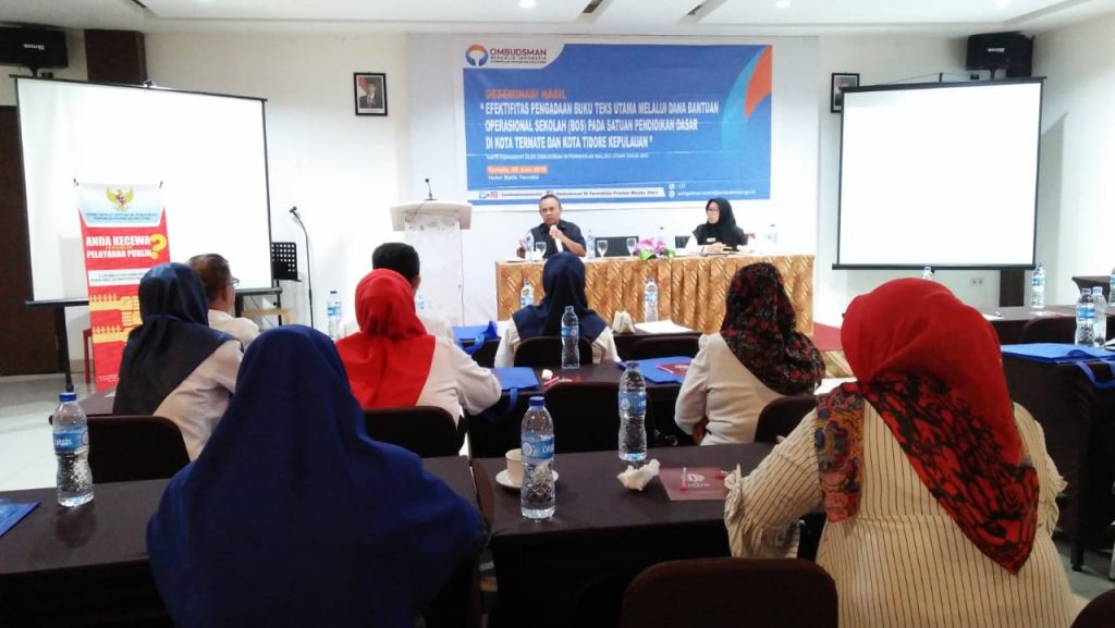 Ternate | TM.com, OMBUDSMAN RI Perwakilan Malut 2019 melaksanakan deseminasi dengan bertajuk. “Efektivitas Pengadaan Buku Teks Utama Melalui Dana Bantuan Operasional Sekolah (BOS) Pada Satuan) Pendidikan Dasar Di Kota Ternate Dan Kota Tidore Kepulauan”. Kegiatan Berlangsung Dihotel Batik, Rabu (6/26)