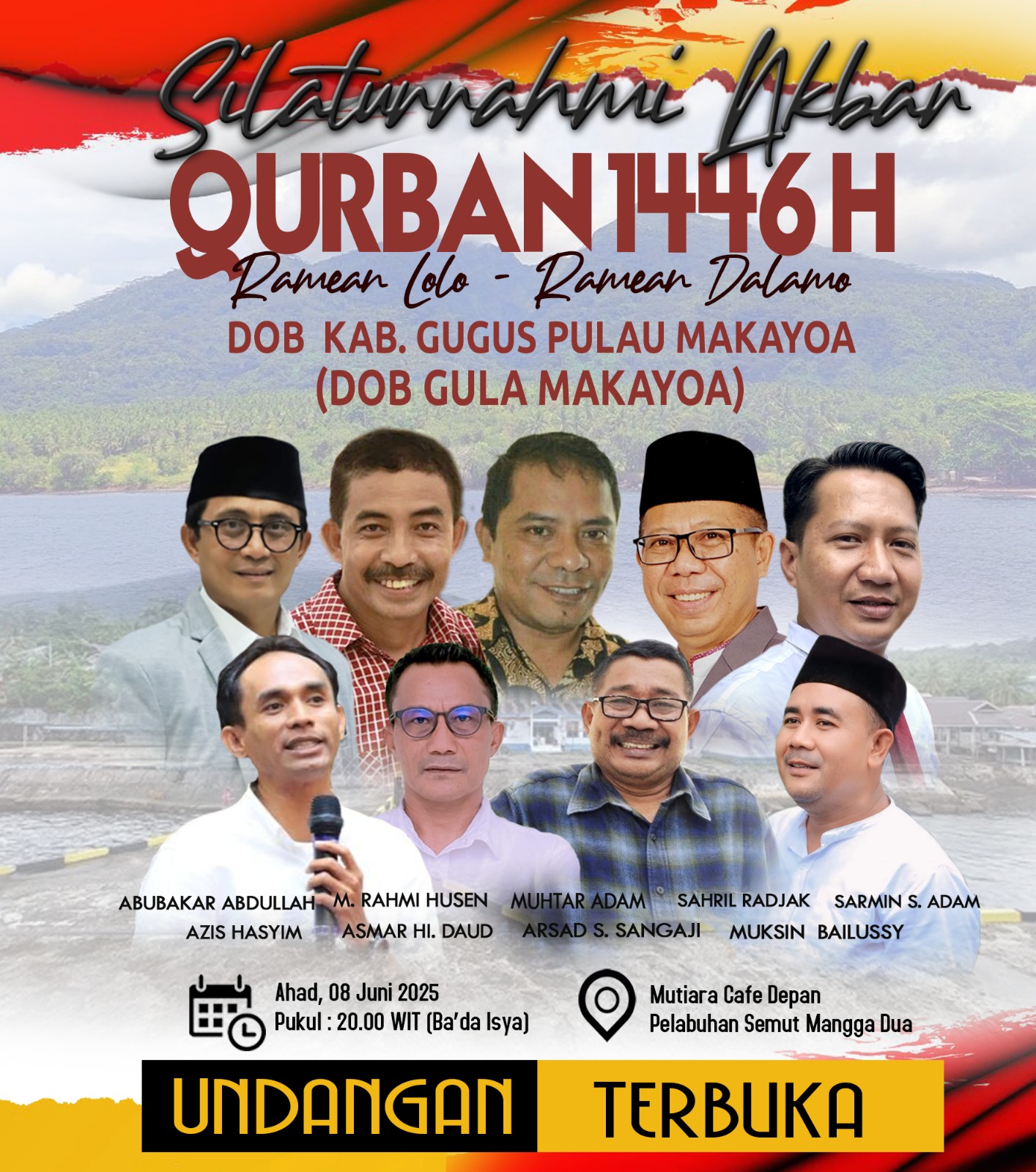 Ternate-TeropongMalut.com, Masyarakat Makian Kasiruta dan Kayoa (MAKAYOA) menjadikan mengelar Silaturrahmi Qurban, yang direncanakan 8 Juni 2025 Pukul 20.00 WIT bertempat di Caffe Mutiara Depan Pelabuhan Semut, Kota Ternate. Demikian disampaikan oleh Arsad Sangadji, inisiator DOB Gugus Pulau Makayoa, kepada media ini Rabu 4 Juni 2025.