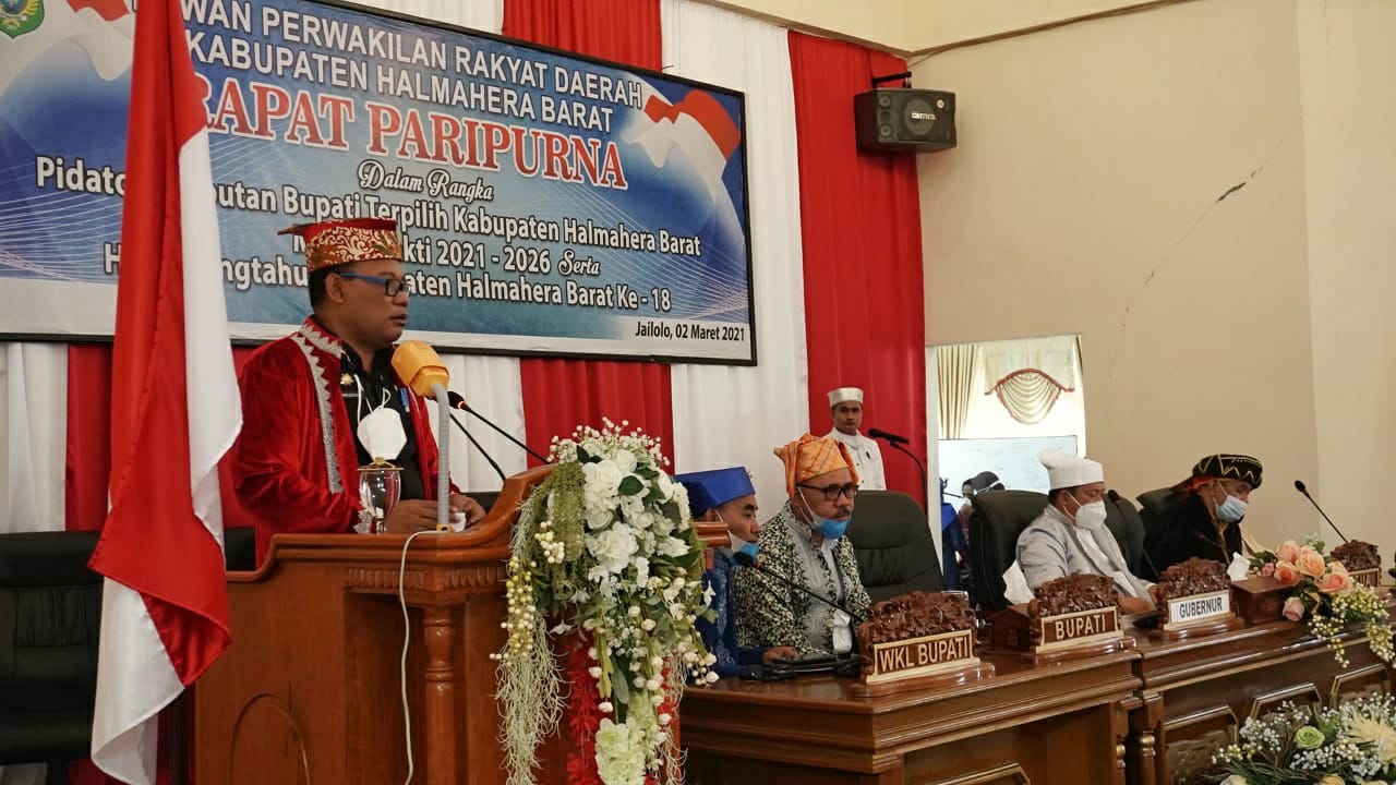 Jailolo -Teropongmalut.com, Sekretaris Daerah Provinsi Maluku Utara, Samsuddin A. Kadir menghadiri undangan rapat paripurna dalam rangka pidato sambutan bupati terpilih kabupaten Halmahera Barat Masa bakti 2021-2026 sekaligus memperingati hari ulang tahun Kabupaten Halmahera Barat yang ke-18 bertempat di Kantor Dewan Perwakilan Rakyat Daerah (DPRD) Kabupaten Halmahera Barat, Selasa (2/3).