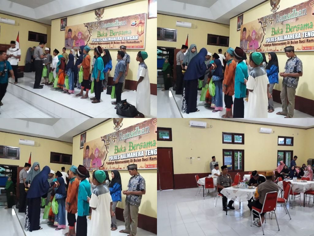 Dalam acara buka bersama tersebut dirangkaikan dengan Tadarus Alqur’an oleh Bhayangkari Cabanag Halteng, pemberian santunan oleh Kapolres Halteng dan Ketua Bhayangkari kepada anak yatim piatu, kemudian di isi dengan Tauziah jelang buka puasa oleh Ustadz Ali Tsabit sekaligus dilanjutkan Sholat Magrib secara berjamaah.