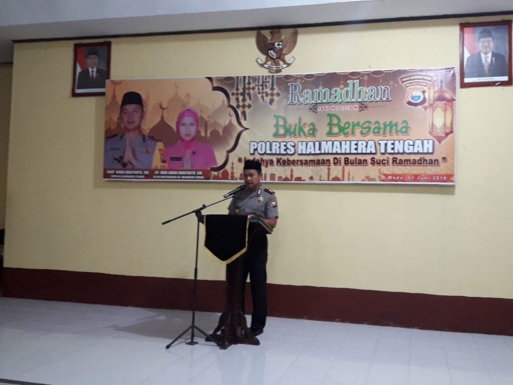 Kapolres Halteng dalam sambutannya mengucapkan rasa terima kasih kepada bapak/ibu yang sempat hadir di acara ini dan kami berharap momen seperti ini terus terjaga untuk kelancaran dan kesuksesan tugas -tugas Polri kedepannya. Semoga bulan ramadhan 1440 H/2019 M ini kita dapat mengambil hikmahnya dalam meningkatkan iman dan takwa kita kepada Allah SWT,” jelasnya.