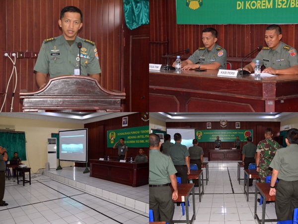 Sementara itu, Danrem 152/Babullah, dalam sambutannya di bacakan oleh Kasi Pers Korem 152/Babullah Letnan Kolonel Caj Waskito,S,sos sosialisasi ini sangat penting karena di jajaran masih memerlukan keseragaman produk atau komunikasi intel padahal sudah ada bujuk akan tetapi masih berbeda,