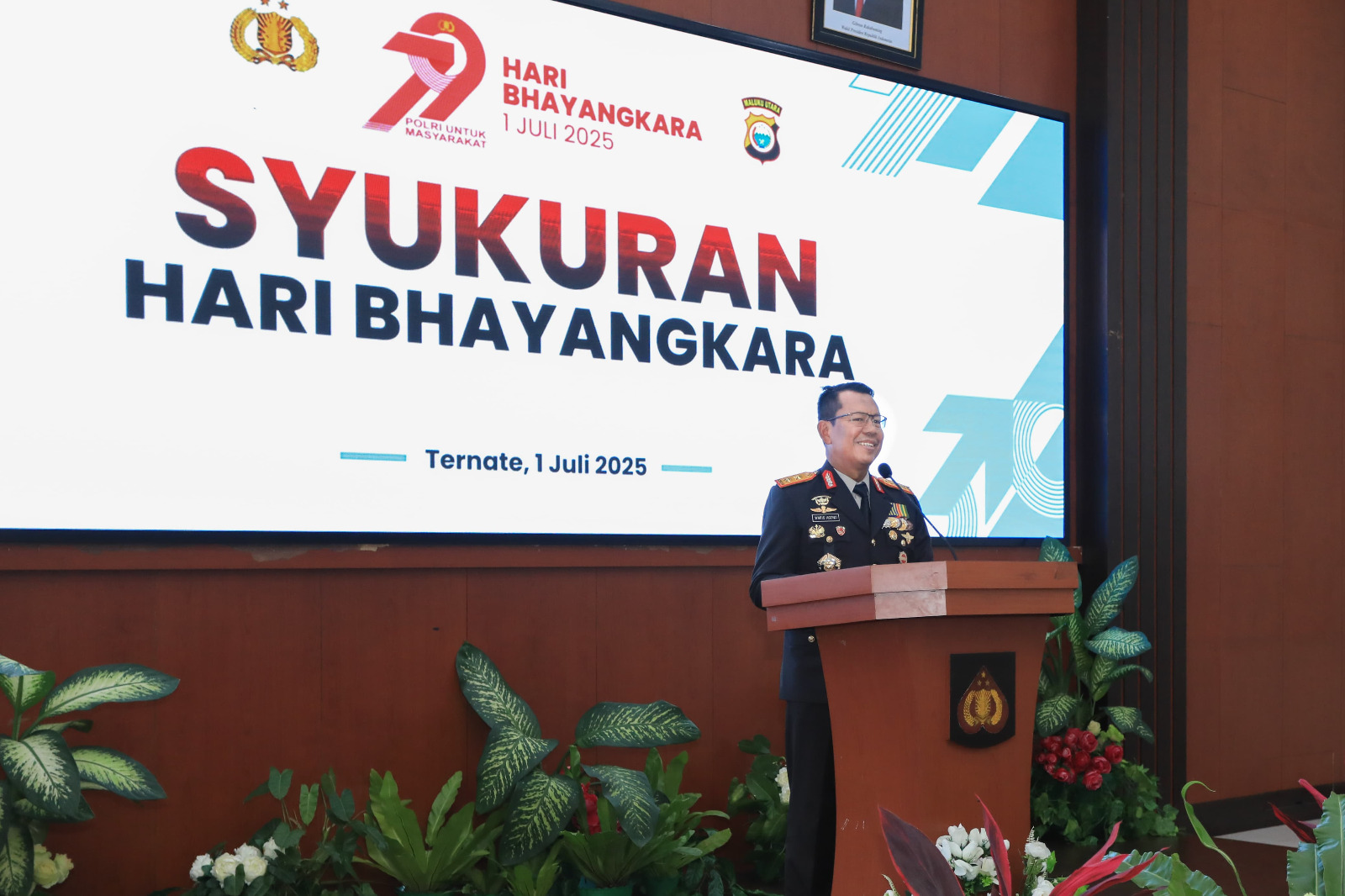 Acara syukuran ini turut dihadiri oleh Kapolda Maluku Utara Irjen Pol. Drs. Waris Agono, M.Si., didampingi Ketua Bhayangkari Daerah Maluku Utara Ny. Sari Waris Agono, Wakapolda Brigjen Pol. Stephen M. Napiun, S.I.K., S.H., M.Hum., serta jajaran pejabat utama Polda Malut.