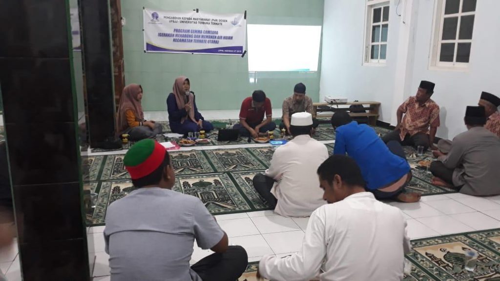 Ternate-TM.com, Dalam rangka pelaksanaan Program Pengabdian Ke Masyarakat (PKM) UPBJJ Universitas Terbuka (UT) Ternate Tahun 2019, dua dosen yakni Lisda A.Simabur, S.Sos, M.Si dan M. Darsan H. Adam, S.IP, M.Si, melakukan sosialisasi program Gerakan Menabung dan Menanam Air Hujan (GEMMA) Camat Utara (CAMTARA) bertempat di Musholla Raudhatul Hidayah Kelurahan Sangaji Utara, Sabtu (3/8/2019)