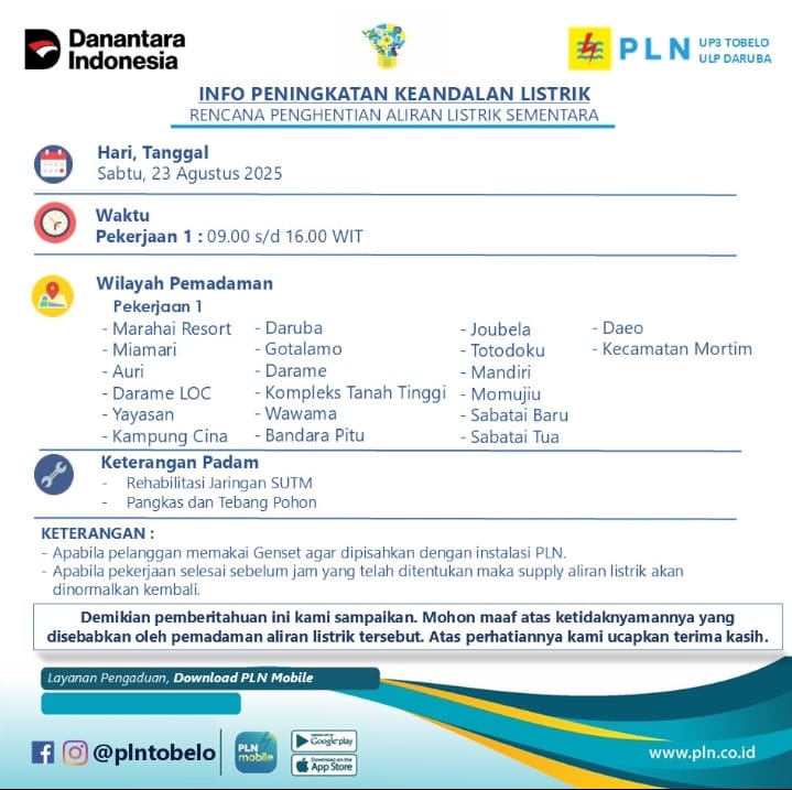 Sesuai Jadwal Pemadaman Resmi Yang Di Keluarkan PT PLN Persero Unit Layanan Daruba Sabtu Tertanggal 23 Agustus 2025! Yaitu Info Peningkatan Keandalan Listrik Rencana Penghentian Aliran Listrik Sementara karena ada Pekerjaan perbaikan 1 yang meliputi wilayah Marahai Resort, Miamari, AURI, Darame Loc, Yayasan, Kampung Cina, Daruba, Gotalamo, Darame,Kompleks Tanah Tinggi , Wawama , Bandara Pitu, Joubela, Totodoku, Mandiri, Momojiu, Sabatai Baru, Sabatai Tua, Daeo, Dan Wilayah Morotai Timur Sambiki Baru Sampai Desa Lifao.